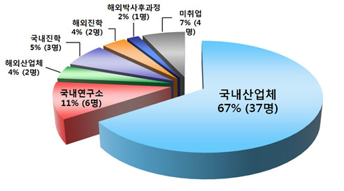 - 산업체 취업사례를 분석해 보면 최근 급성장한 석유화학 및 전자재료 분야의 사례가 가장 많았으며 이외에도 생명공학, 자동차 및 중공업 등 다양한 분야로 진출하는 것으로 집계됨.