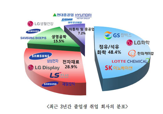 - 지난 3년간 졸업생들이 취업한 회사들을 업종별로 비율을 검토해 보면 석유화학 및 전자재료 분야의 취업사례가 가장 많았으며, 이외에도 생명공학 분야, 중공업 및 자동차 등등 다양한 분야에 취업하고 있는 것으로 집계되었음.