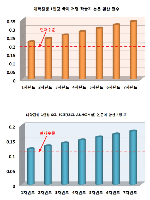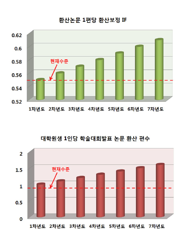 - 현재 졸업요건으로 규정된 논문 업적 기준 (석사의 경우 학위 기간 중 1편, 박사의 경우 학위 기간 중 3편, 주저자)을 준수하며, 학위 기간 장기화 방지 제도를 운영할 경우 달성이 가능한 목표임.