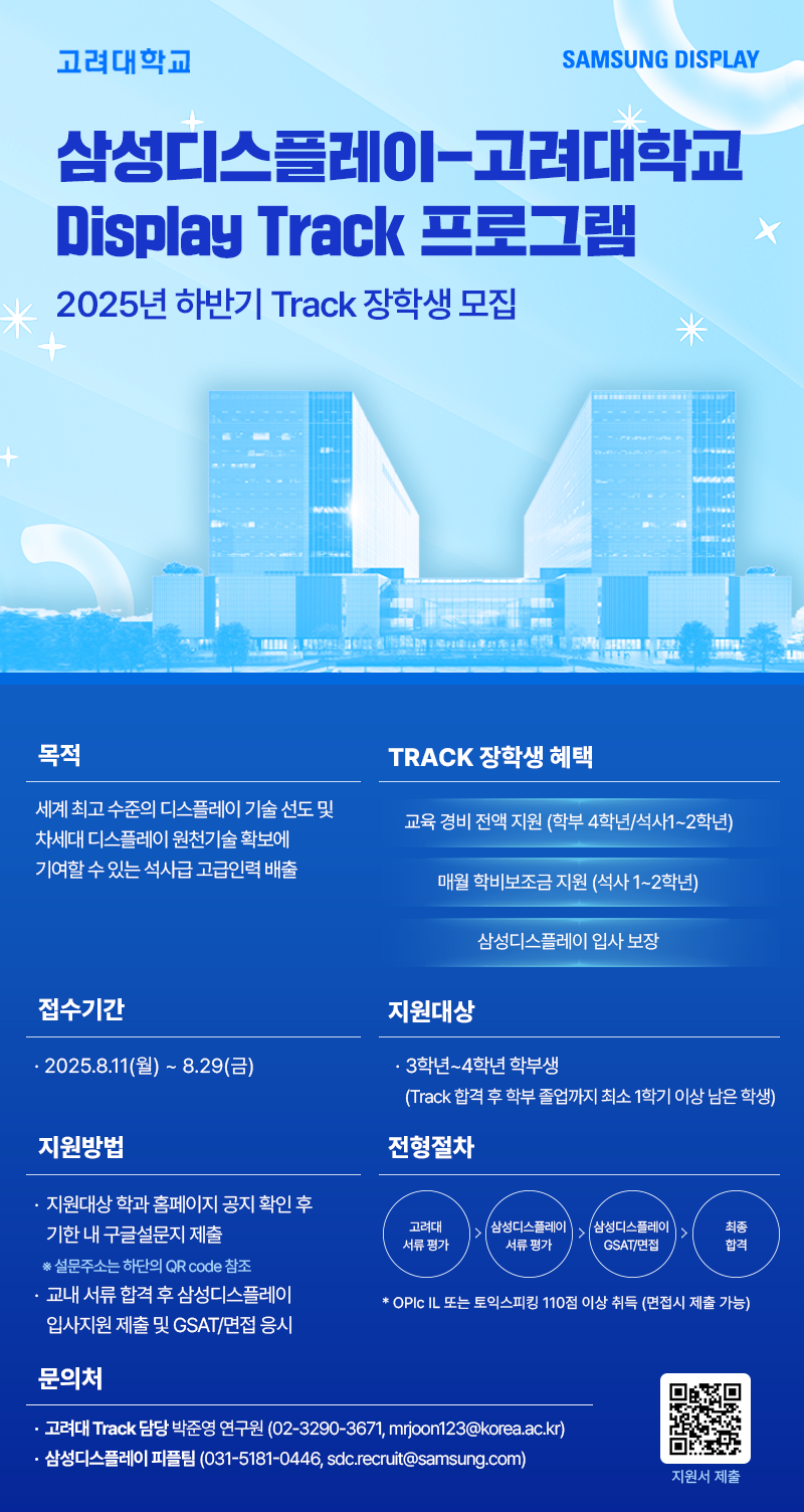 '디스플레이 트랙'은 삼성디스플레이와 고려대학교가 디스플레이 교육 과정을 공동운영하며 우수 인재를 선발, "학사 1년(4학년)+석사 2년"의 등록금과 학비보조금을 지원하고 졸업 후에는 입사를 보장하는 프로그램입니다. 접수 마감일은 8월 29일(금)까지입니다. 관심 있는 학생들의 적극 참여 바랍니다. ▶ Display Track 안내 ▷ 자격 요건 ① 학기: 참여학과 학사 3학년, 4학년 재학생 (이중전공자 가능, Track 합격 후 학부 졸업까지 최소 1학기 이상 남은 학생) ② 학점: 3.0 이상 / 4.5 점 (전 학년 유지) ③ 어학: Opic IL 이상, 토익스피킹 5급 이상 ( 면접 전 제출 必 ) ④ 군미필자 지원 가능 (입사 전 복무 필수) ① 등록금(학부 4학년/석사1~2학년) 및 학비보조금(석사 1~2학년) ▷ 참여 학과: 기계공학부, 산업경영공학부, 신소재공학부, 전기전자공학부, 화공생명공학과 지원서 접수(고려대) > 지원서 접수(SDC) > 직무적성검사(GSAT) > 면접 아래 구글 스프레드 시트로 접수 [ 접수 마감일: 8월 29일(금)까지 ] : 이름, 생년월일, 학번, 이메일, 연락처, 학과, 학년 및 재학증명서 (첨부), 성적 및 성적증명서 (첨부) 이메일 문의: mrjoon123@korea.ac.kr (담당 조교), khj0507@korea.ac.kr (담당 직원), cshin@korea.ac.kr (신창환 교수님) ② 자기개발 휴학 (최대 1년), 군 휴학 (최대 24개월) 가능
