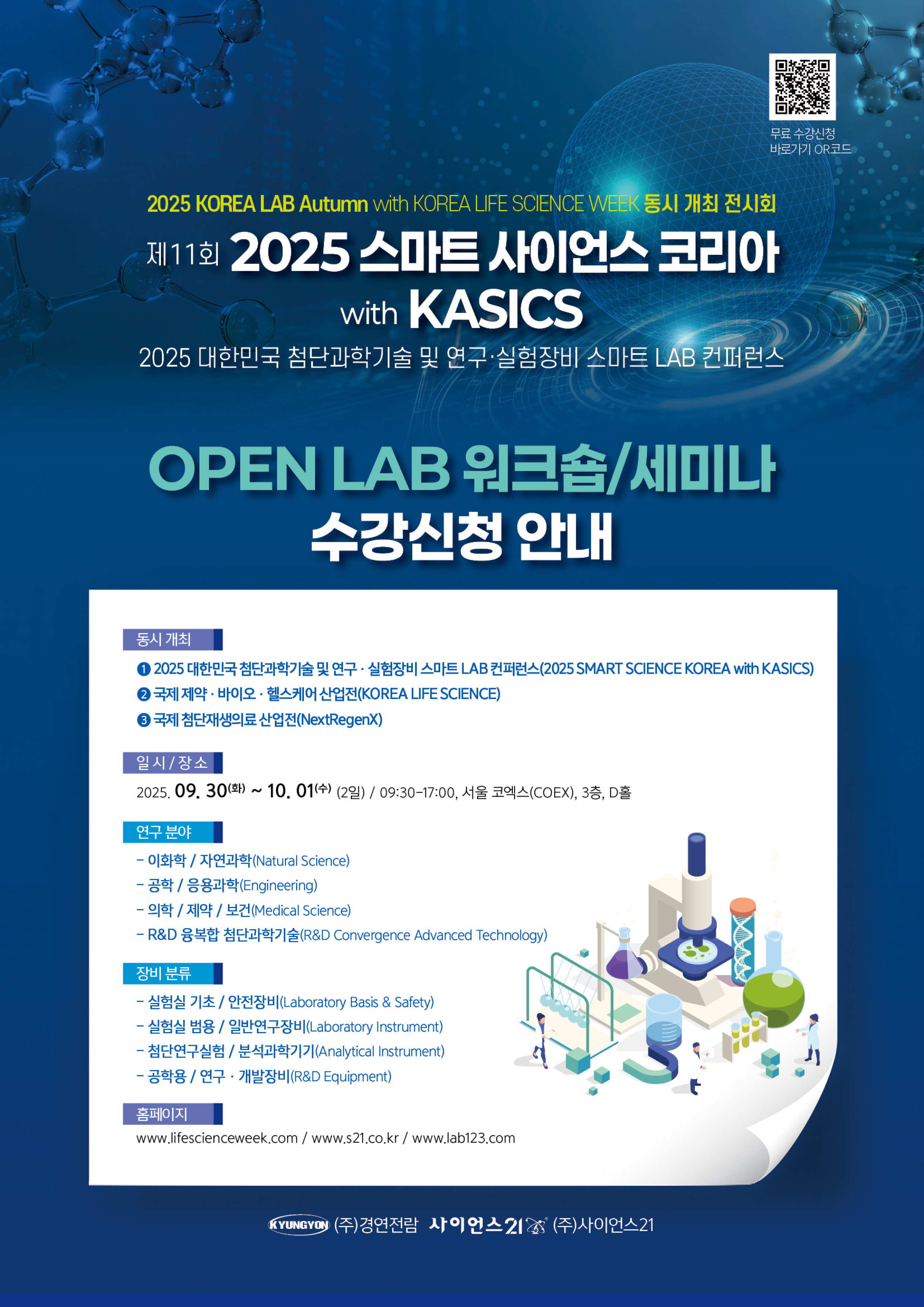 ■ 일 시: 2025. 09. 30(화) ~ 10. 01(수), 09:30 ~17:00 ■ 장 소: 서울 COEX, 3층 D홀 ■ 동시개최: 1) KOREA LAB Autumn (국제연구.실험장비.분석과학기기 및 R&D 융복합 첨단과학기술 전시회) 2) KOREA LIFE SCIENCE (국제 제약.바이오.헬스케어 산업전) 3) NextRegenX (국제 첨단재생의료 산업전) ■ 연구분야: - 이화학 / 자연과학(Natural Science) - 공학 / 응용과학(Engineering) - 의학 / 제약 / 보건(Medical Science) - R&D 융복합 첨단과학기술(R&D Convergence Advanced Technology) ■ 장비분류: - 실험실 기초 / 안전장비(Laboratory Basis & Safety) - 실험실 범용 / 일반연구장비(Laboratory Instrument) - 첨단연구실험 / 분석과학기기(Analytical Instrument) - 공학용 / 연구.개발장비(R&D Equipment)
