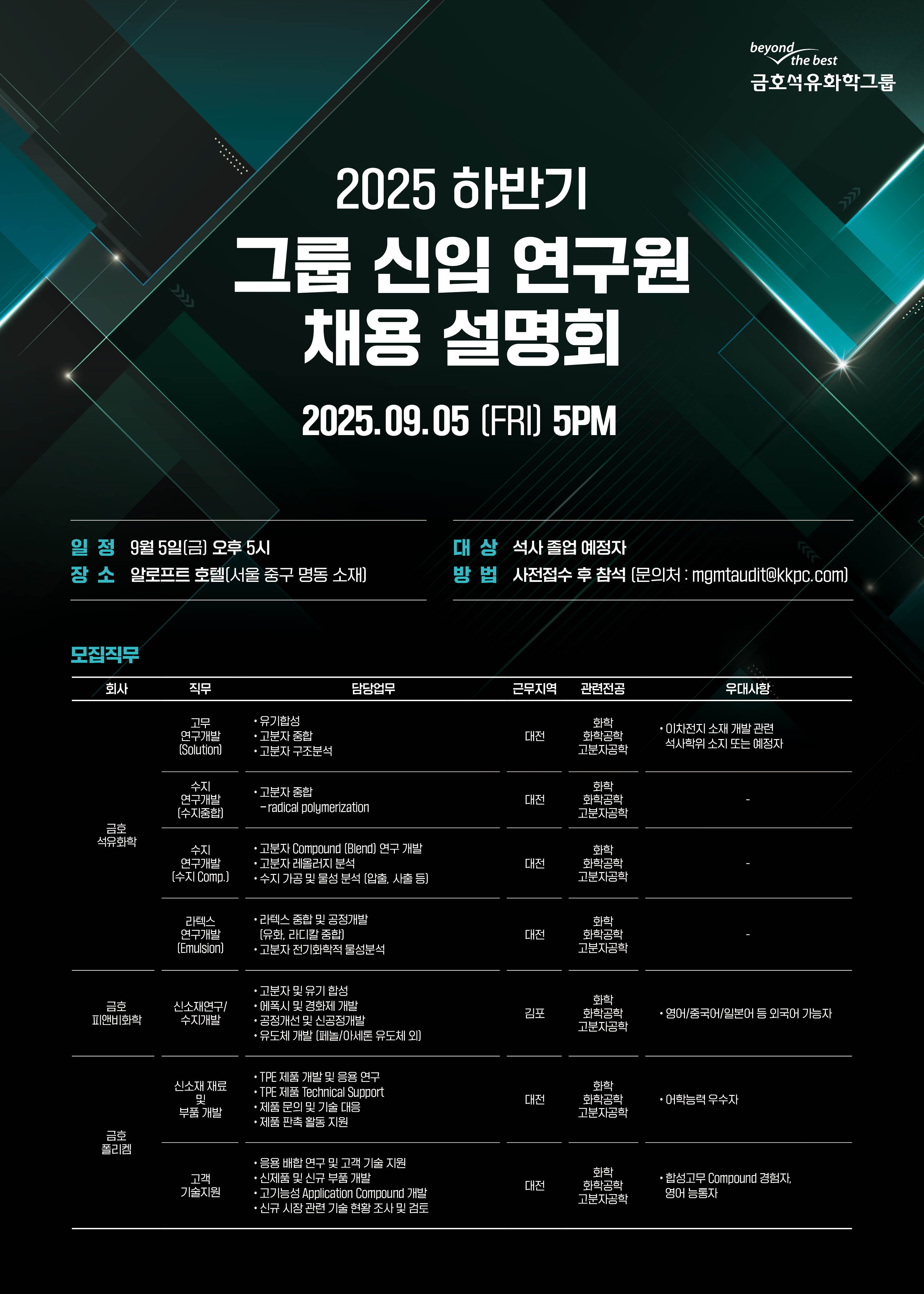 금호석유화학, 2025 하반기 그룹 신입 연구원 채용 설명회