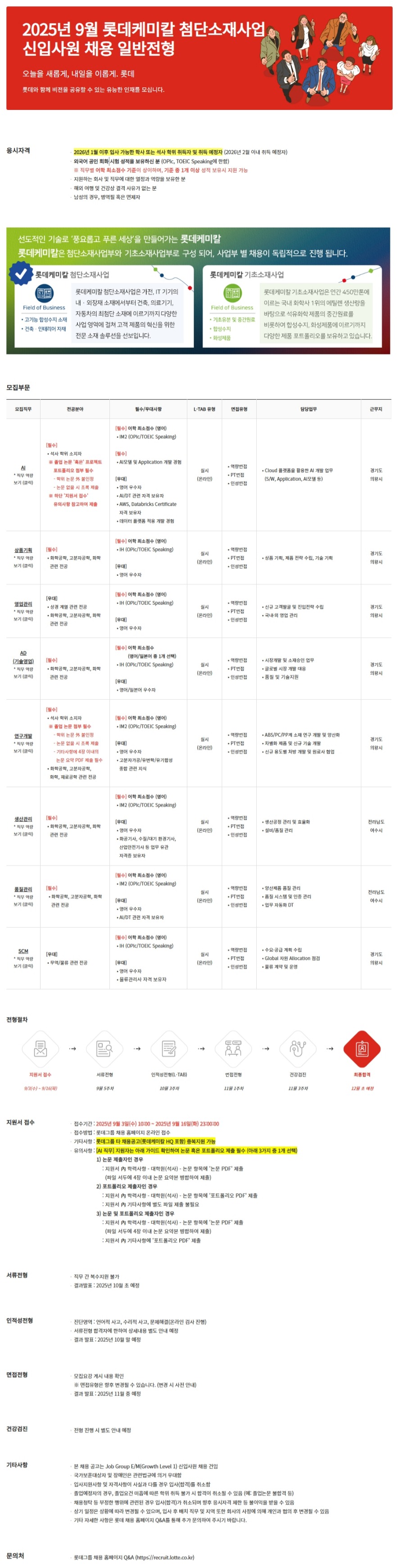 - 공고명 : 2025년 9월 롯데케미칼 첨단소재사업 신입사원 채용 일반전형