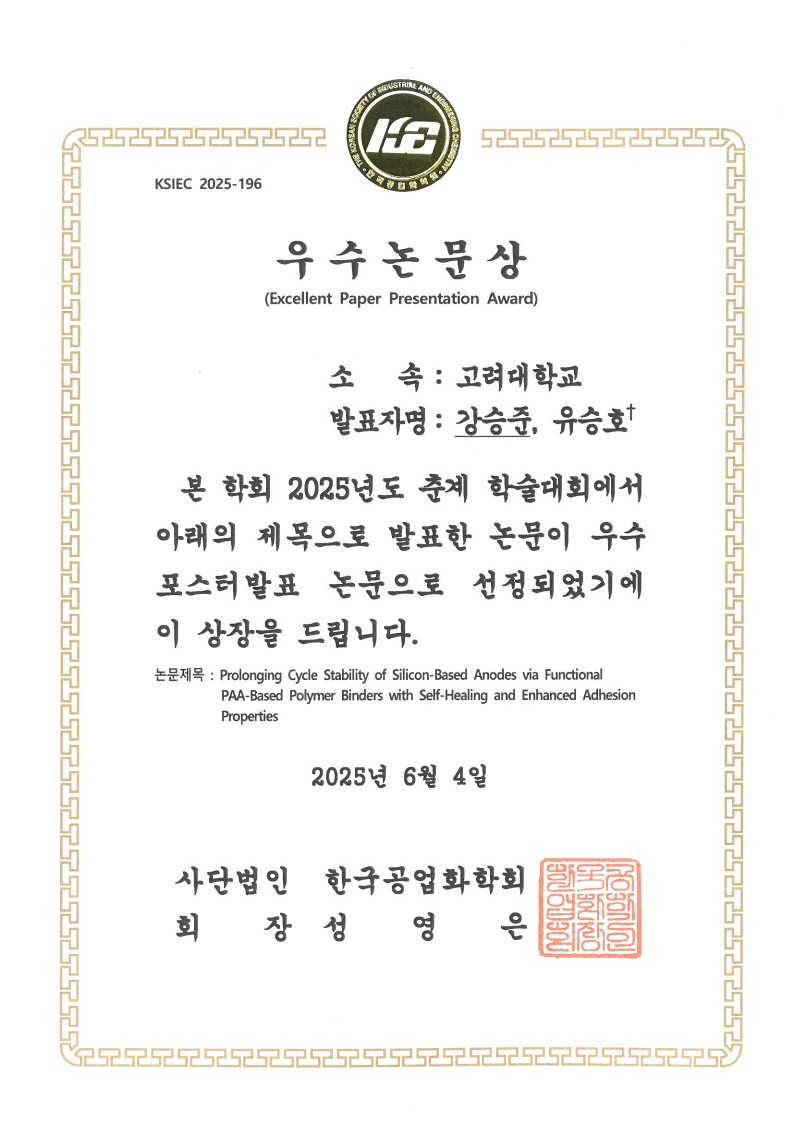 석박사통합과정 강승준 학생(지도교수: 유승호)이 한국공업화학회가 주최한 2025년도 춘계 학술대회에서 'Prolonging Cycle Stability of Silicon-Based Anodes via Functional PAA-Based Polymer Binders with Self-Healing and Enhanced Adhesion Properties'를 주제로 포스터 우수논문상(Excellent Paper Presentation Award)을 수상하였습니다.