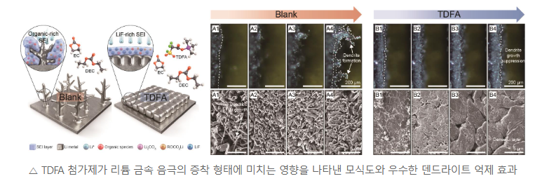 공동 연구팀은 TDFA가 덴드라이트 생성을 억제하고, 안정적인 계면을 형성하여 배터리 수명과 충전 효율 개선에 중요한 역할을 한다는 사실을 증명했다. 이번 연구는 리튬 금속 계면에서 첨가제의 작용 방식을 정밀하게 밝혀, 차세대 리튬 금속 배터리 상용화를 위한 계면 설계 전략에 중요한 방향성을 제시했다는 점에서 의미가 크다.*덴드라이트: 전극 표면에 리튬 결정이 쌓이는 현상