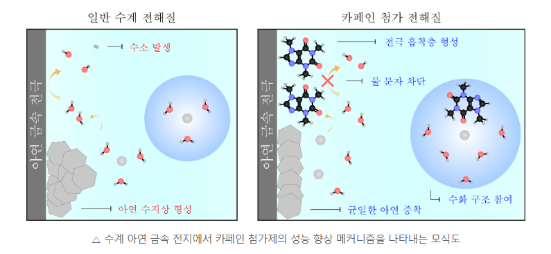 이에 연구팀은 각성 물질로 알려진 카페인을 수계 전해질의 첨가제로 활용했다. 연구팀은 카페인 분자를 활용해 아연 이온의 수화 구조를 변형시키고, 음극 표면에 얇은 흡착층을 형성함으로써 전해질 내 수소 발생 반응을 억제했다. 동시에 아연 금속의 균일한 증착을 유도해 전지의 안정성과 수명을 향상시켰다. 그 결과, 0.02 몰(M) 농도로 첨가된 미량의 카페인만으로도 아연 금속 전지의 구조적 안정성을 획기적으로 개선하는데 성공했다.