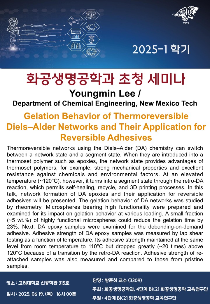 화공생명공학과 초청 세미나를 아래와 같이 진행할 예정이오니, 관심 있는 학생 분들의 많은 참여 바랍니다.