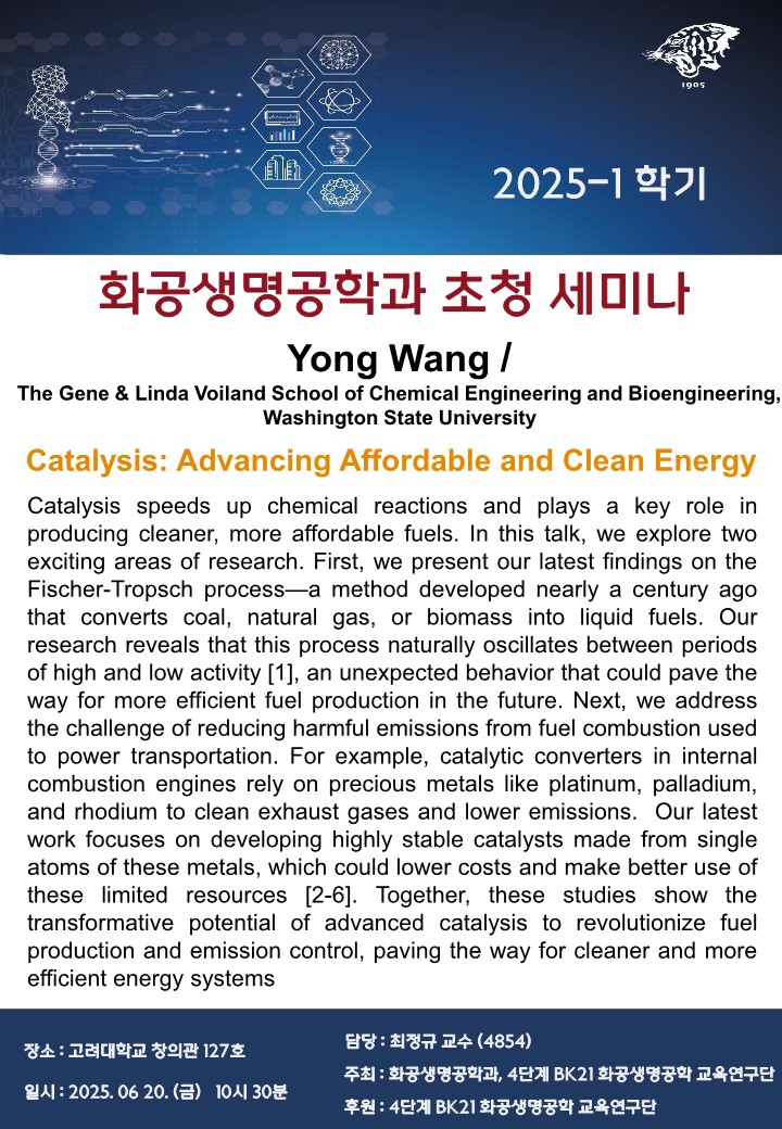 ■ 연 사 :  Prof. Yong Wang (School of Chemical Engineering and Bioengineering, Washington State University)