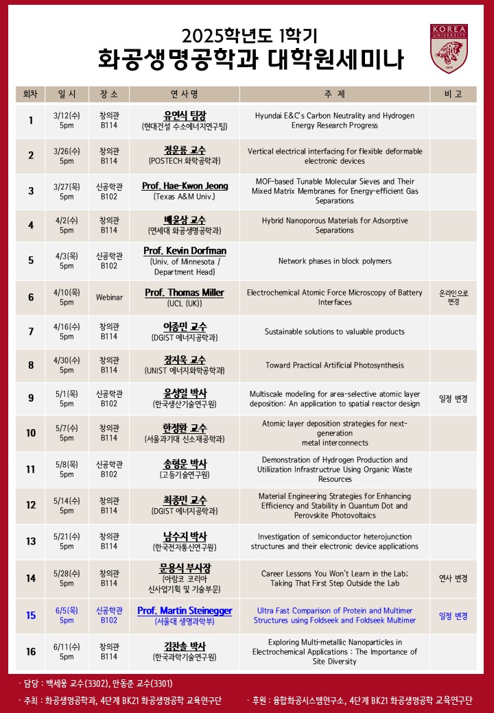 1. 2025-1학기 대학원세미나는 '대면수업'으로 진행되며, 1차 대학원세미나는 3월 12일(수)에 개최될 예정입니다. 2. 대학원세미나Ⅰ,Ⅲ는 동일한 과목입니다. 대학원세미나Ⅰ는 수요일에만, 대학원세미나Ⅲ는 목요일에만 진행되는 일정이 아니라, 아래의 일정표대로 통합하여 진행될 예정이오니, 참고 바랍니다. 수요일 세미나 장소는 창의관 B114호, 목요일 세미나 장소는 신공학관 B102호이니,착오 없으시길 바랍니다. - 6차 4/10(목) Prof. Thomas Miller의 세미나는 Webinar(온라인 세미나)로 진행되오니, 참고 바랍니다. - 5/22(목) 윤성일 박사님의 세미나는 5/1(목)으로 일정이 변경되었으니, 착오 없으시기 바랍니다. - 5/28(수) 세미나는 아람코 코리아, 문용식 부사장님의 세미나로 연사가 변경되었으니, 참고 바랍니다. - 서울대 Martin Steinegger 교수님의 세미나는 6/5(목)으로 일정이 변경되었으니, 참고 바랍니다. (6/12(목) 세미나 없음/ 최종 세미나는 6/11(수)임) 3. 세미나 출석 인정은 차수별로 세미나가 종료된 직후, 조교에게 '대학원세미나 참가확인서'를 직접 제출해야 인정됩니다. (양식은 붙임 파일로 첨부) '대학원세미나 참가확인서 양식'은 본인이 직접 출력하여 지참하셔야 합니다. 현장에서 배부하지 않습니다. 4. 16회 세미나를 모두 참석해야 하는 것은 아니지만, 이 중 10회 이상의 세미나는 반드시 참석해야 성적이 부여됩니다. (세미나 10회 미만 참석 시, F학점 부여) 세부적인 성적 부여 안내 사항은 분반별 조교가 블랙보드에 공지할 예정이오니, 반드시 확인 바랍니다. 5. 강연 제목은 정해지는대로 업데이트할 예정입니다.